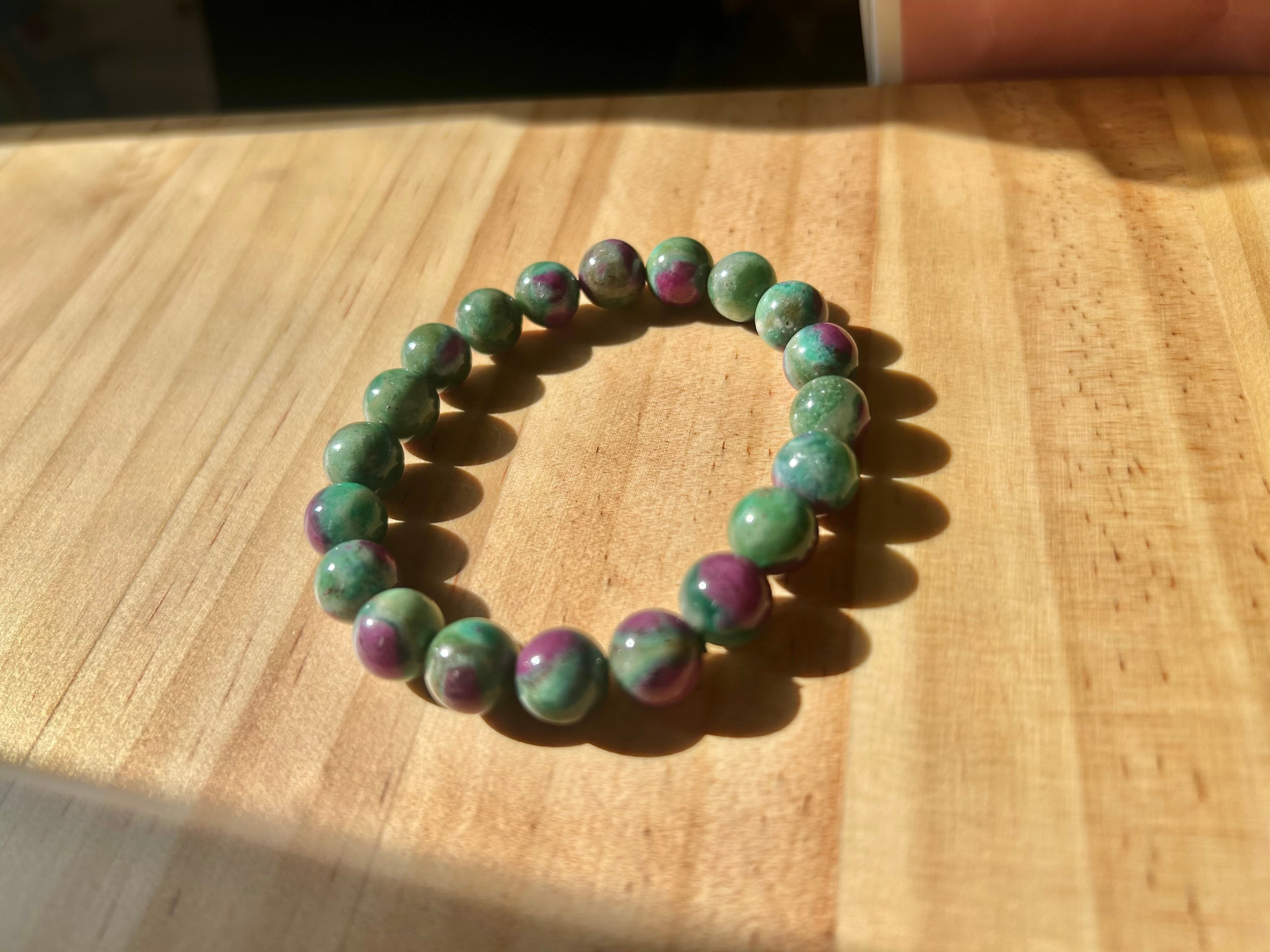 グリーンと赤紫が美しく混ざり合う、ルビーインゾイサイトのブレスレットです。