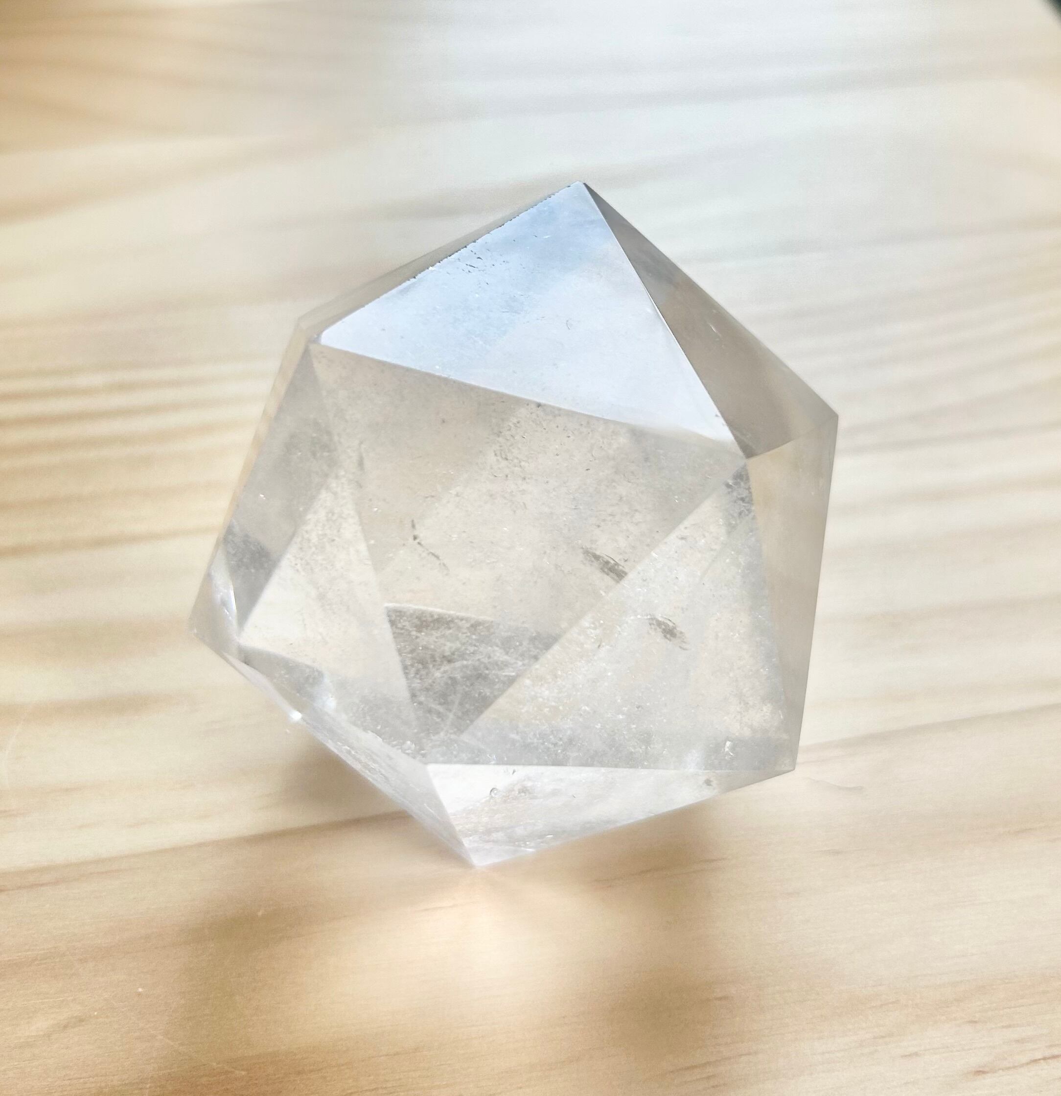 20の面が均等に光を反射し、空間と意識をやわらかく整える高波動の水晶。