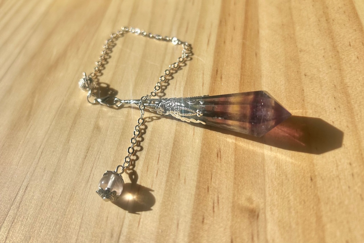 フローライトの色彩が優しく重なり、揺らぎながら輝くペンデュラム。