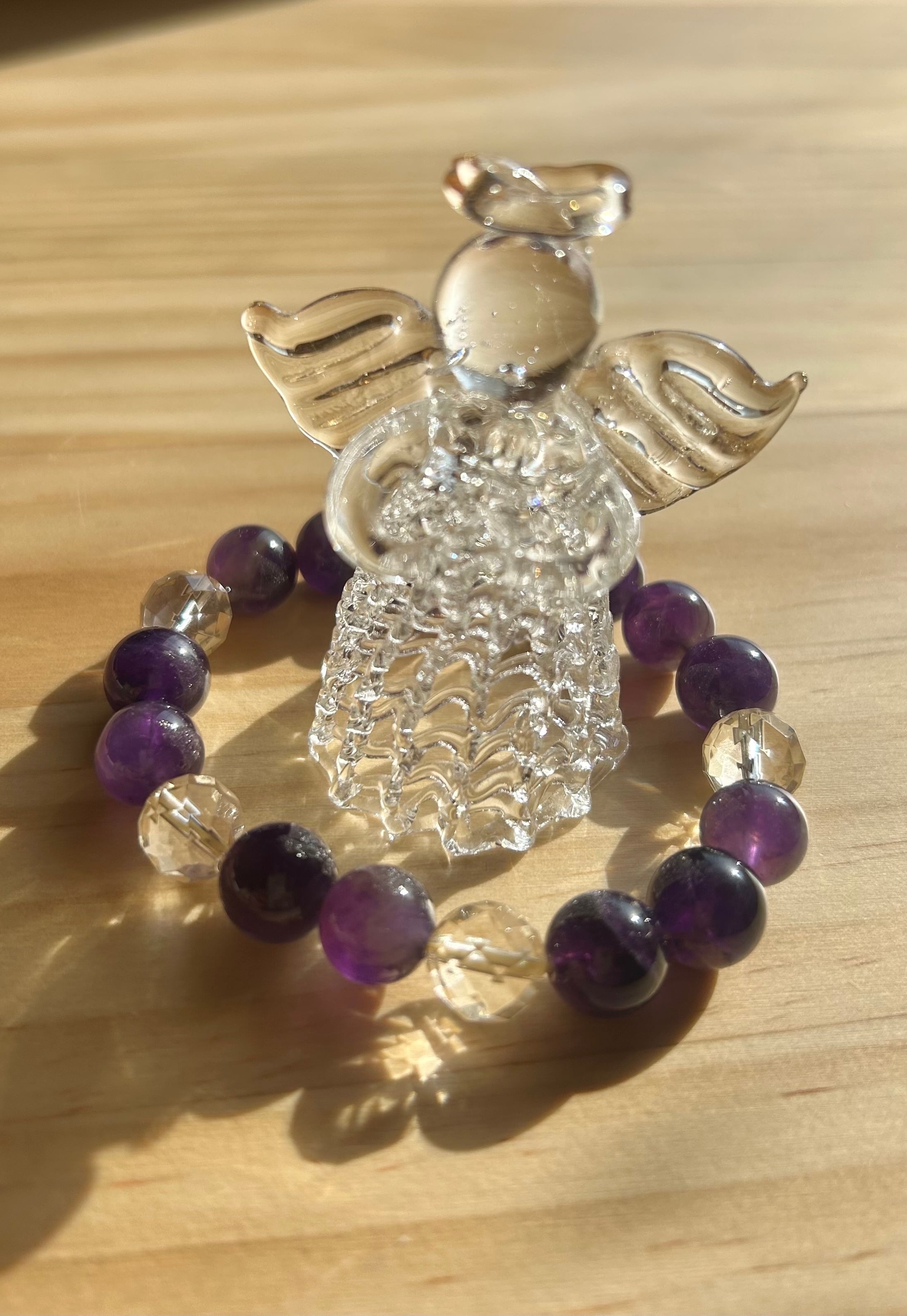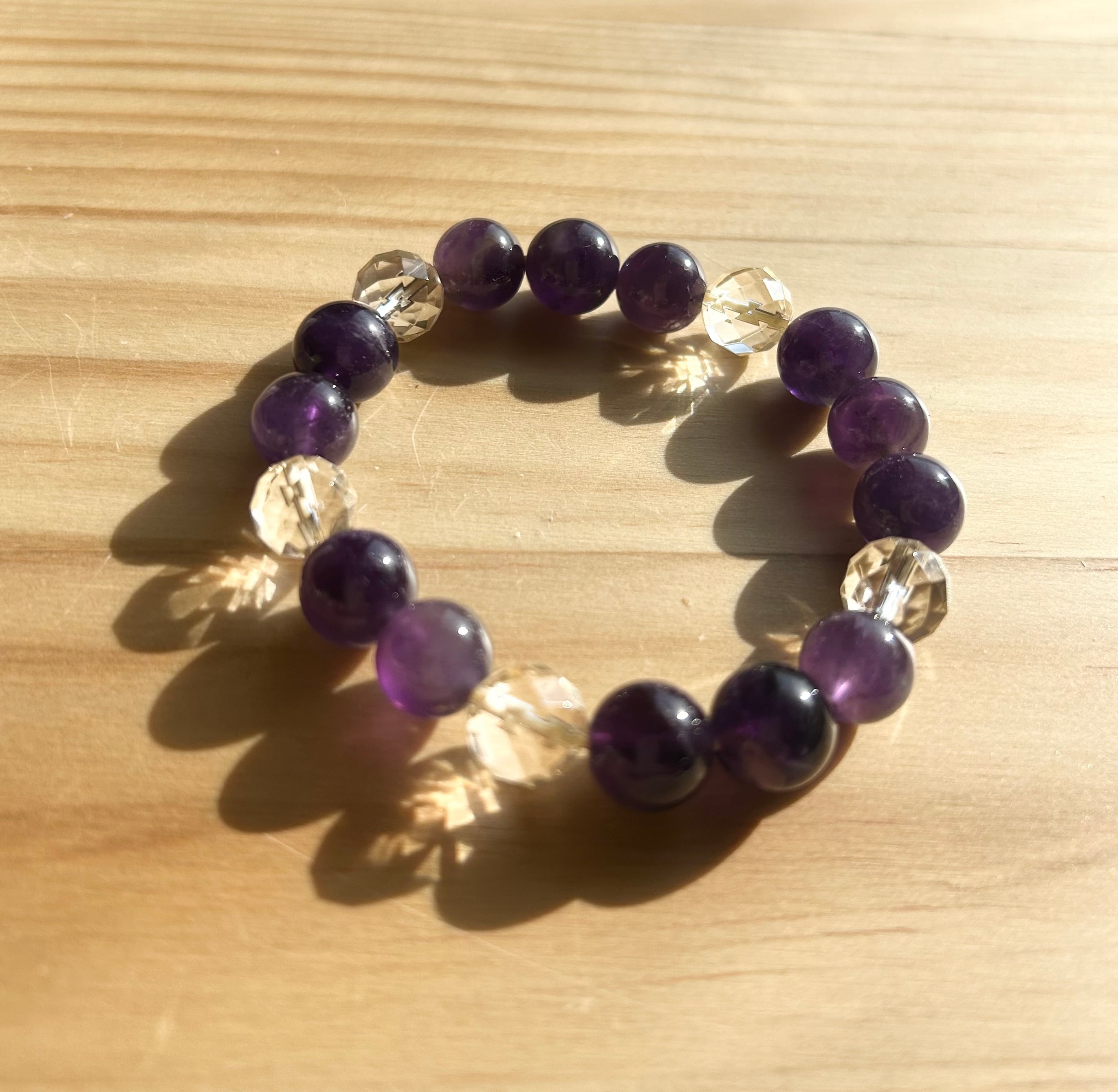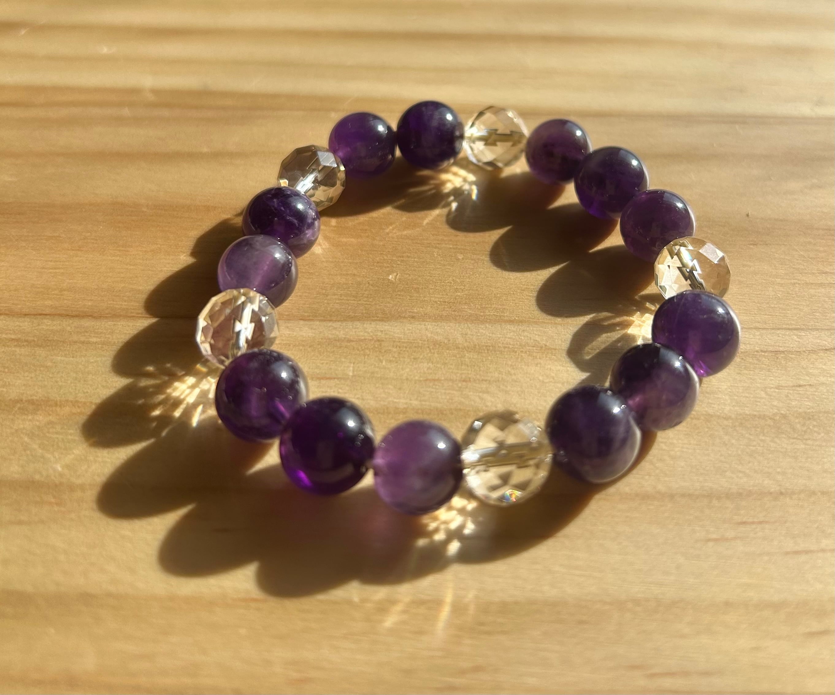 深い紫の静寂を宿すアメジストと、内側から発光するシャンパンカラー水晶。