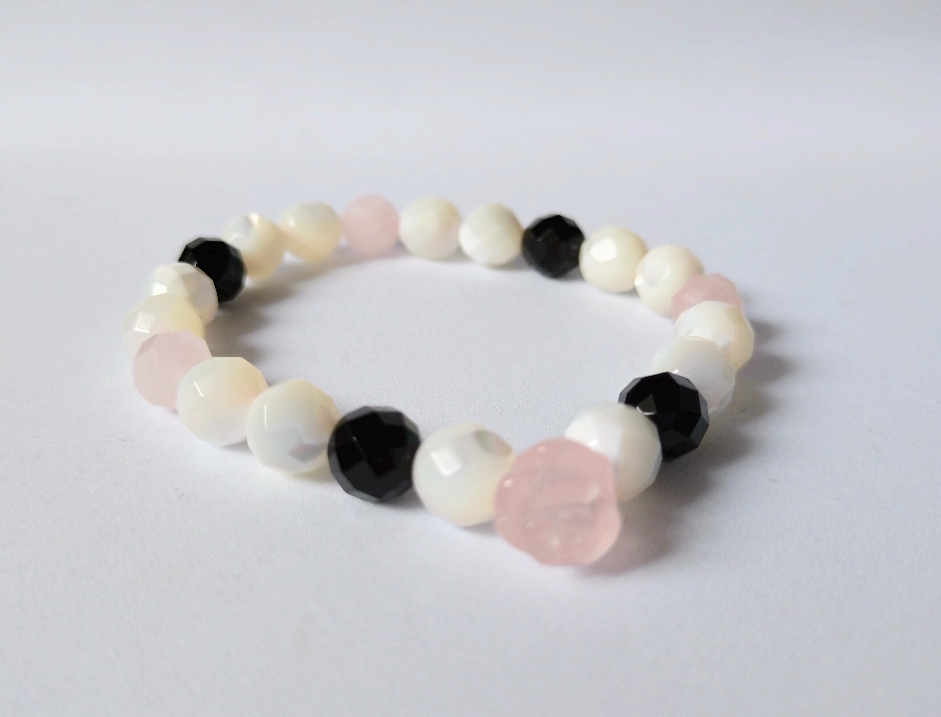 薔薇カットのローズクォーツと、マザーオブパール、オニキスの8ミリブレスレットです。