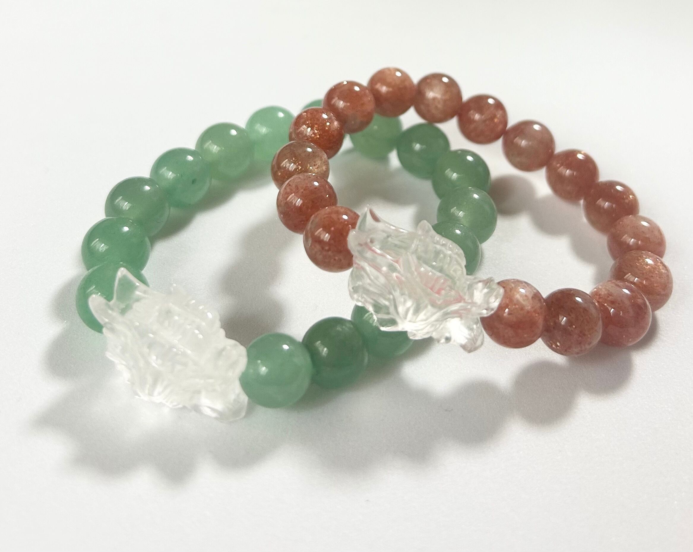 水晶の龍頭と10mm丸玉のグリーンアベンチュリンのブレスレットです。